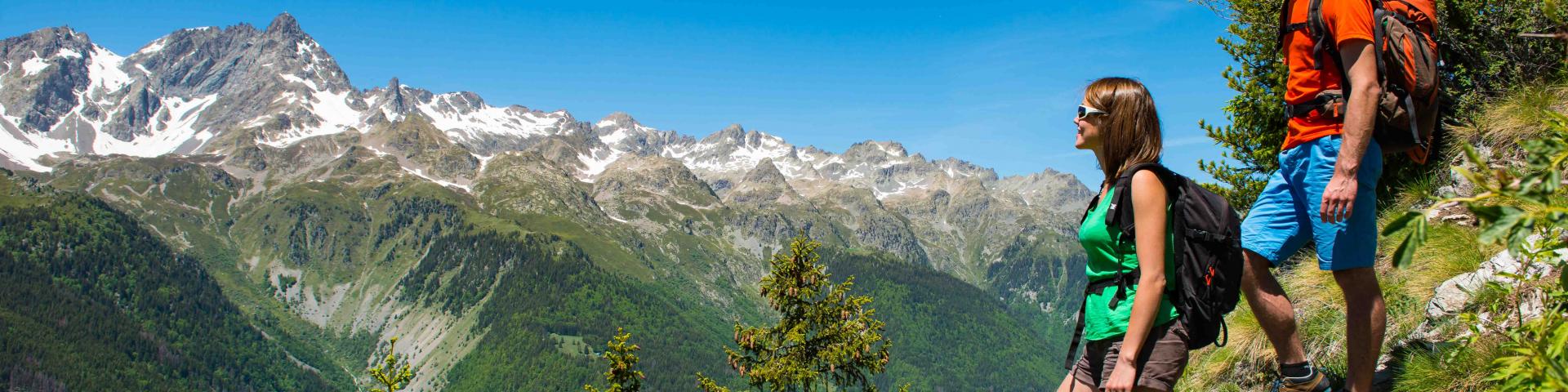 Un vététiste descend une piste avec une télécabine en arrière plan ©Pistes Vtt Descente Oz|OT Oz en Oisans MOUNTAINBIKE2 randonneurs observant la montagne ©Randonneurs |OT Oz en Oisans Wandelingen©Images et Rêves Cyclo